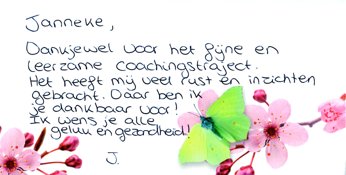 WEER EEN POSITIEVE BLIK - Zowel op gebied van werk als privé voelde ik me niet goed in mijn vel. Dankzij de gesprekken met Janneke en de inzichten die ze me gaf voel ik me veel beter. Nu heb ik niet alleen een positievere blik op de toekomst maar ook op mezelf. Enorm dankbaar voor de tijd en de rust die ik heb gekregen.